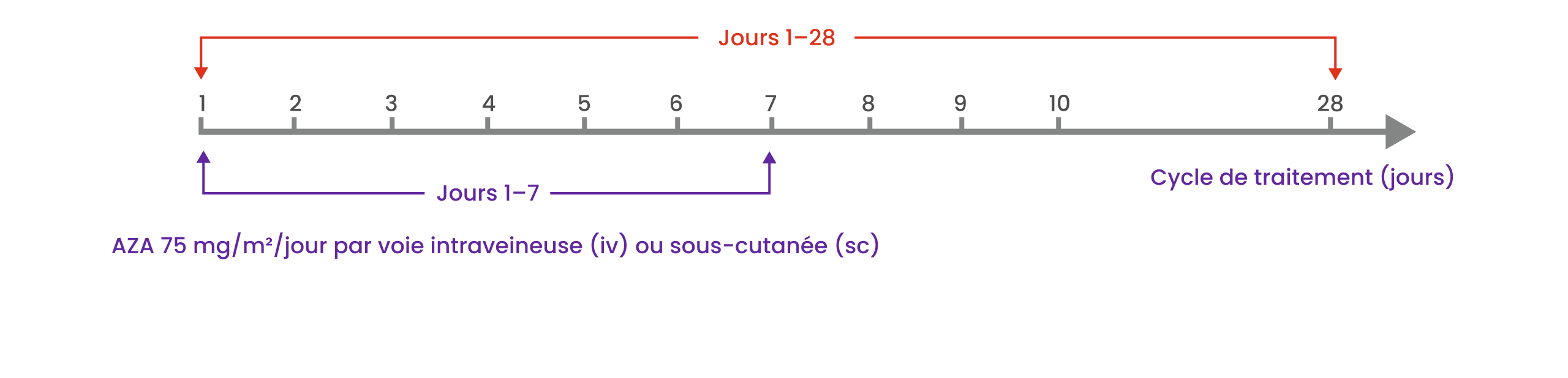 TIBSOVO® doit être pris le Jour 1 Cycle 1 et administré une fois par jour durant un cycle de 28 jour. Il doit être pris en association avec l’azacitidine à 75 mg/m² de surface corporelle, par voie intraveineuse ou sous-cutanée, une fois par jour les jours 1-7 de chaque cycle de 28 jours. Pendant le premier cycle de traitement, il faut administrer 100 % de la dose d’azacitidine.
